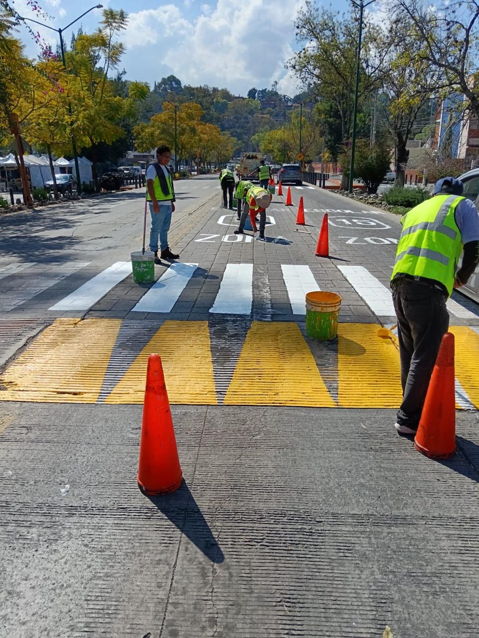 El equipo especializado de CEBRAS de la SEDUM está realizando un balizamiento integral, que incluye la demarcación de cruces escolares, pasos peatonales, flechas de sentido, señales de velocidad, líneas de alto y divisorias de carriles. Estas mejoras contribuirán a aumentar la visibilidad y la seguridad tanto para peatones como para conductores.