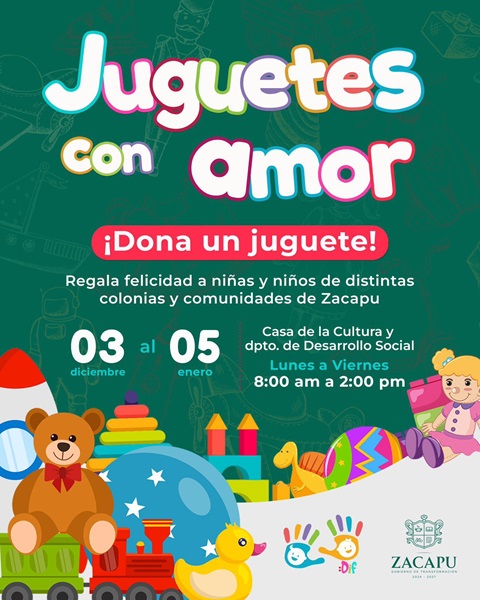 Afirmó que en conjunto con el Sistema DIF Zacapu se realizará esta colecta de juguetes hasta el día 5 de enero, y se recibirán las donaciones en las instalaciones de la Casa de la Cultura en un horario de 8:00 a 14:00 horas.