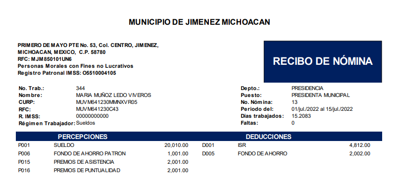 Mary Muñoz Ledo proporcionó copia de su recibo de nómina en la que se aprecia un sueldo neto de 18 mil pesos quincenalmente, es decir, mensualmente su salario es de aproximadamente 36 mil pesos.