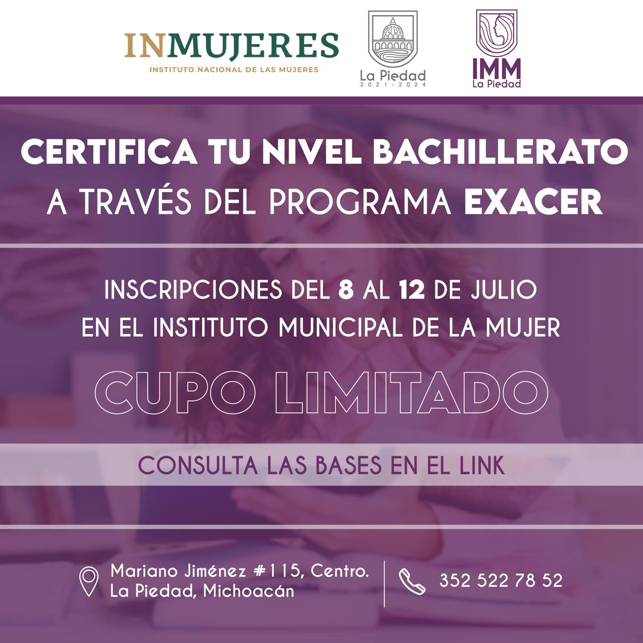La Piedad, Michoacàn a 04 de Julio del 2024.- Con la finalidad de fomentar el acceso educativo de las mujeres, el Gobierno Municipal de La Piedad, a través del Instituto Municipal de la Mujer y en aplicación del programa PROABIM, abren convocatoria para la certificación de nivel bachillerato a mujeres que tengan este nivel de estudios inconcluso.