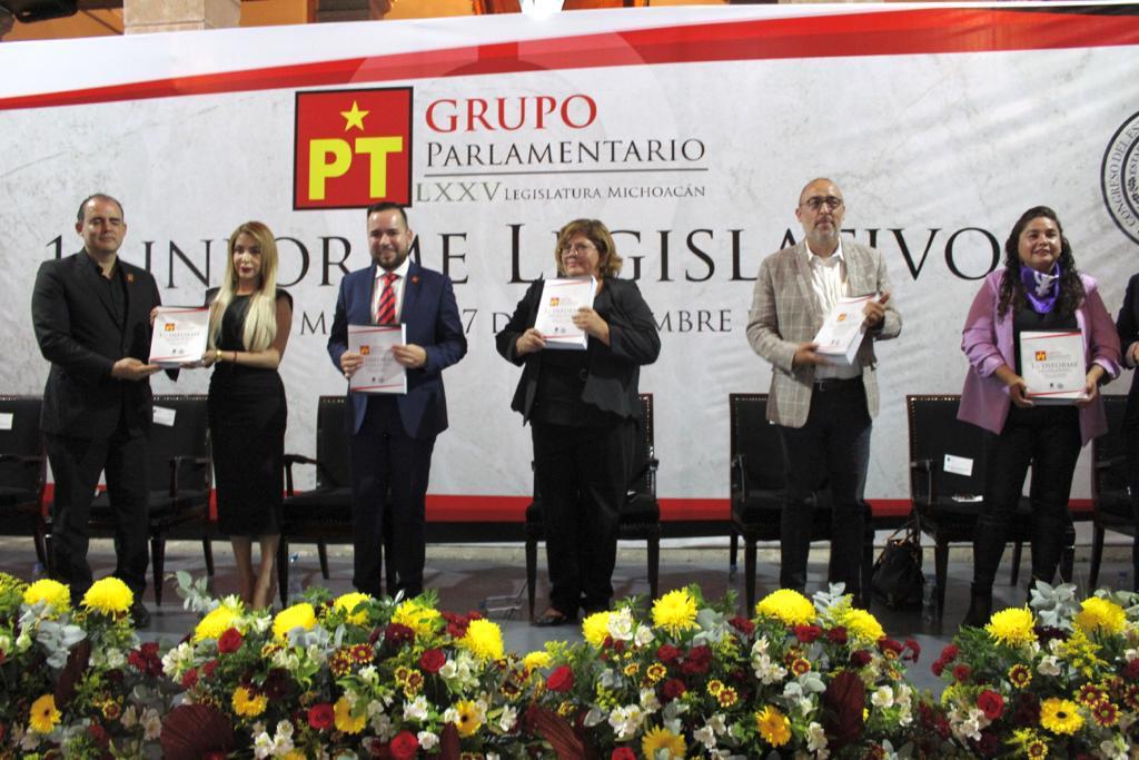 Morelia Michoacán 28 de septiembre del 2022.- Arropados por militantes y simpatizantes, el Grupo Parlamentario del Partido del Trabajo (GPPT), rindió su Primer Informe de Actividades Legislativas, donde reafirmó su compromiso como representante del pueblo y con su lucha por más y mejores derechos sociales.