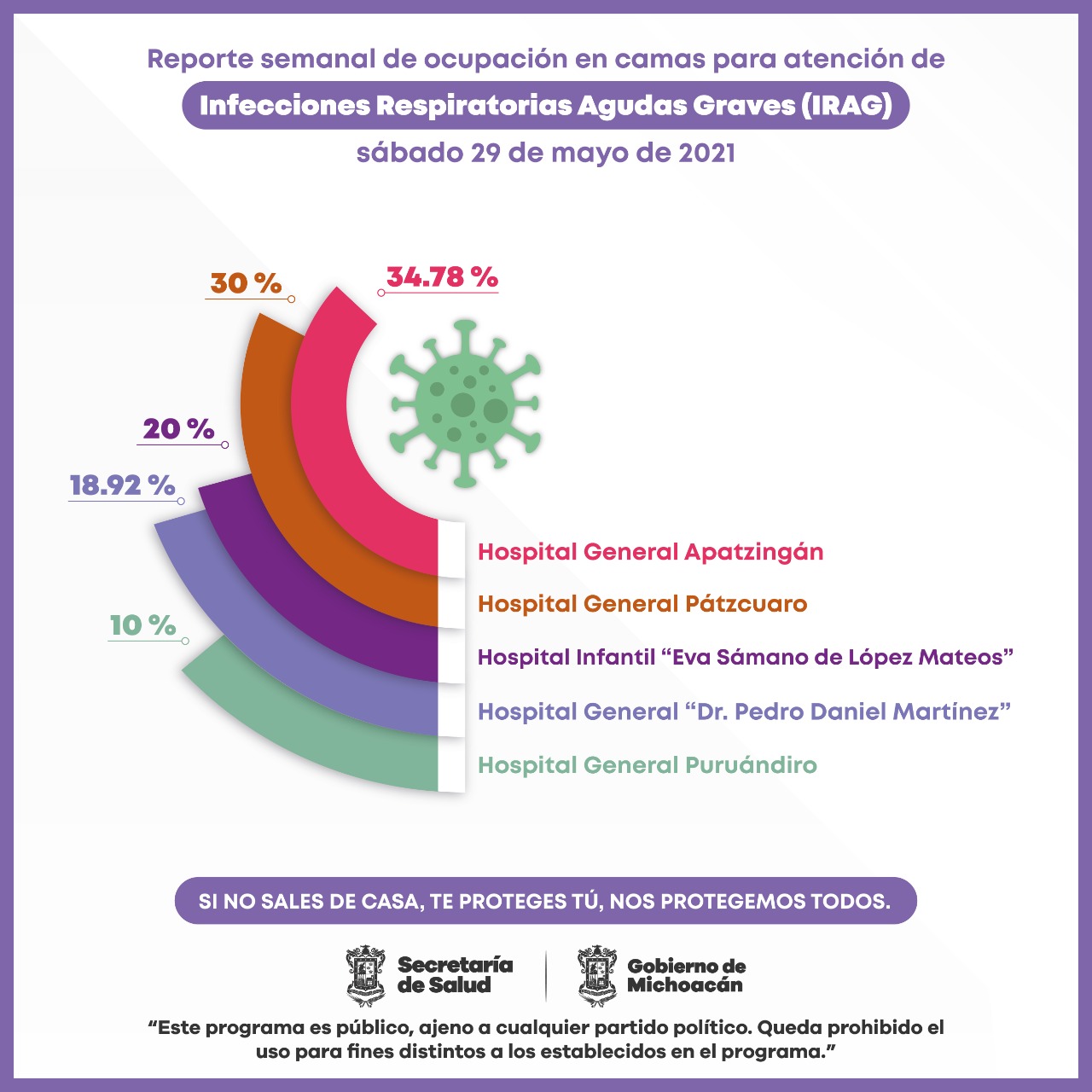 Morelia, Michoacán, a 29 de mayo de 2021.- La Secretaría de Salud de Michoacán (SSM), informa sobre la ocupación de camas para la atención de Infecciones Respiratorias Agudas Graves (IRAG) en sus unidades médicas.