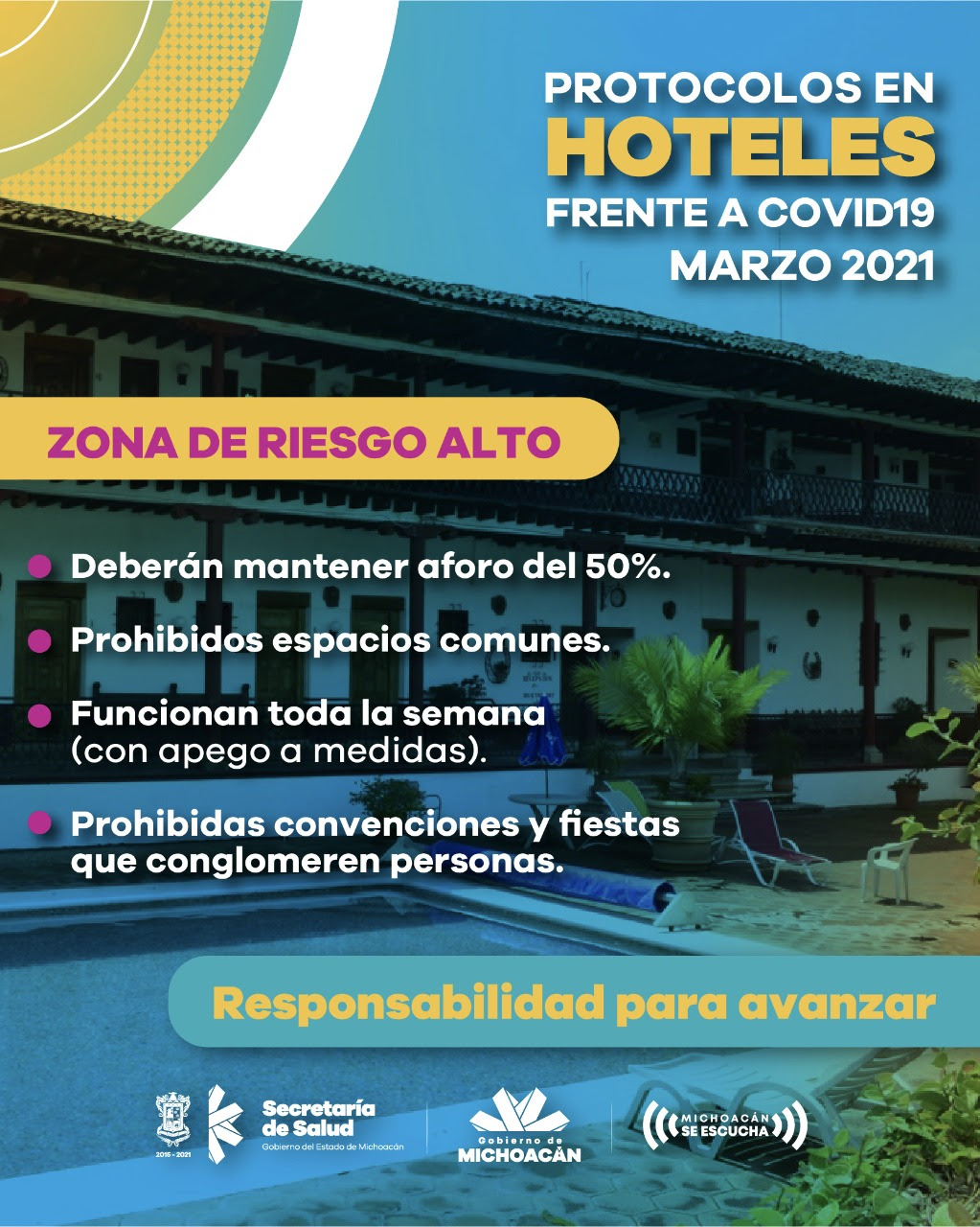 Morelia, Michoacán, a 3 de marzo de 2021.- Con el objetivo de lograr una apertura gradual del sector económico en Michoacán sin desatender las medidas contra el COVID-19, este mes los hoteles deberán cumplir de manera estricta los protocolos emitidos por las autoridades de salud.