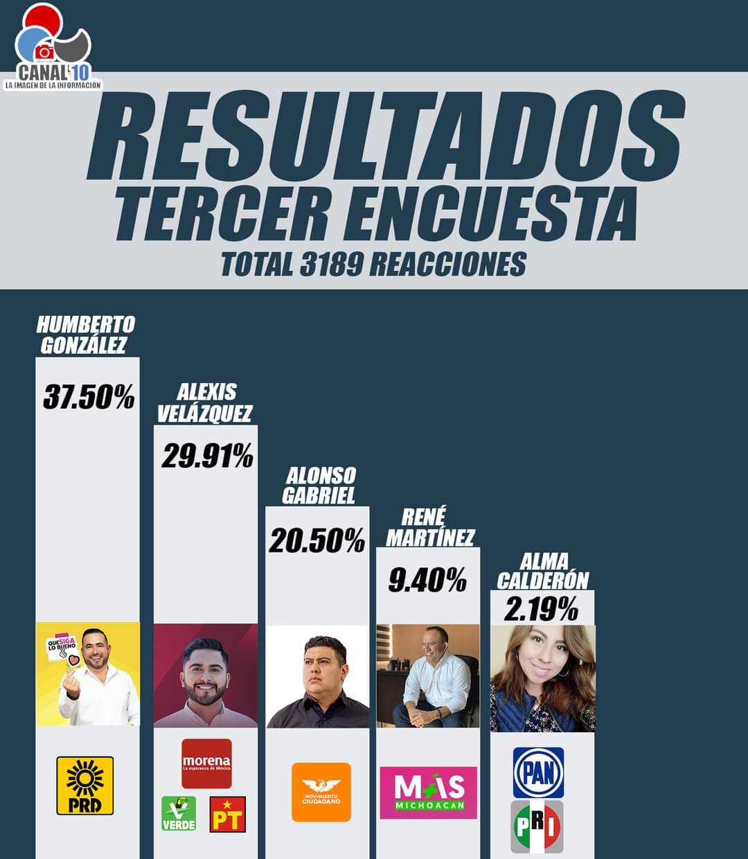El reciente ejercicio realizado por Canal 10 la Imagen de la Información en el municipio, de 3 mil 189 participantes en la encuesta, Humberto González la ganó con 37.50 por ciento de los votos, le sigue Alexis Velázquez con 29.91 por ciento, Alonso Gabriel con 20.50 por ciento, Rene Martínez con 9.40 por ciento y Alma Calderón con 2.19 por ciento.