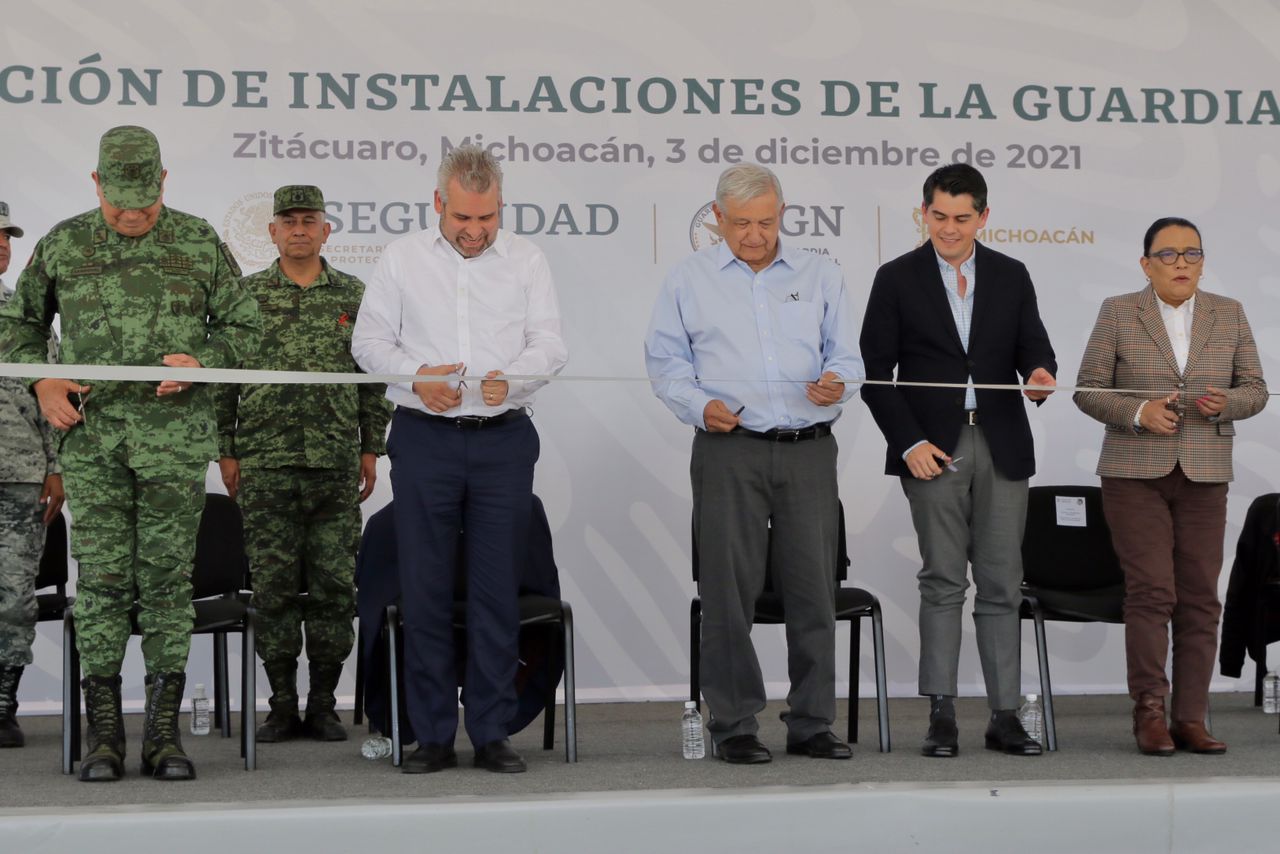 Zitácuaro, Michoacán, 3 de diciembre del 2021.- El gobernador Alfredo Ramírez Bedolla y el presidente de la República, Andrés Manuel López Obrador inauguraron las instalaciones del Cuartel de la Guardia Nacional ubicado en Zitácuaro y ahí, se anunció la apertura de otros complejos en Michoacán para el próximo año.