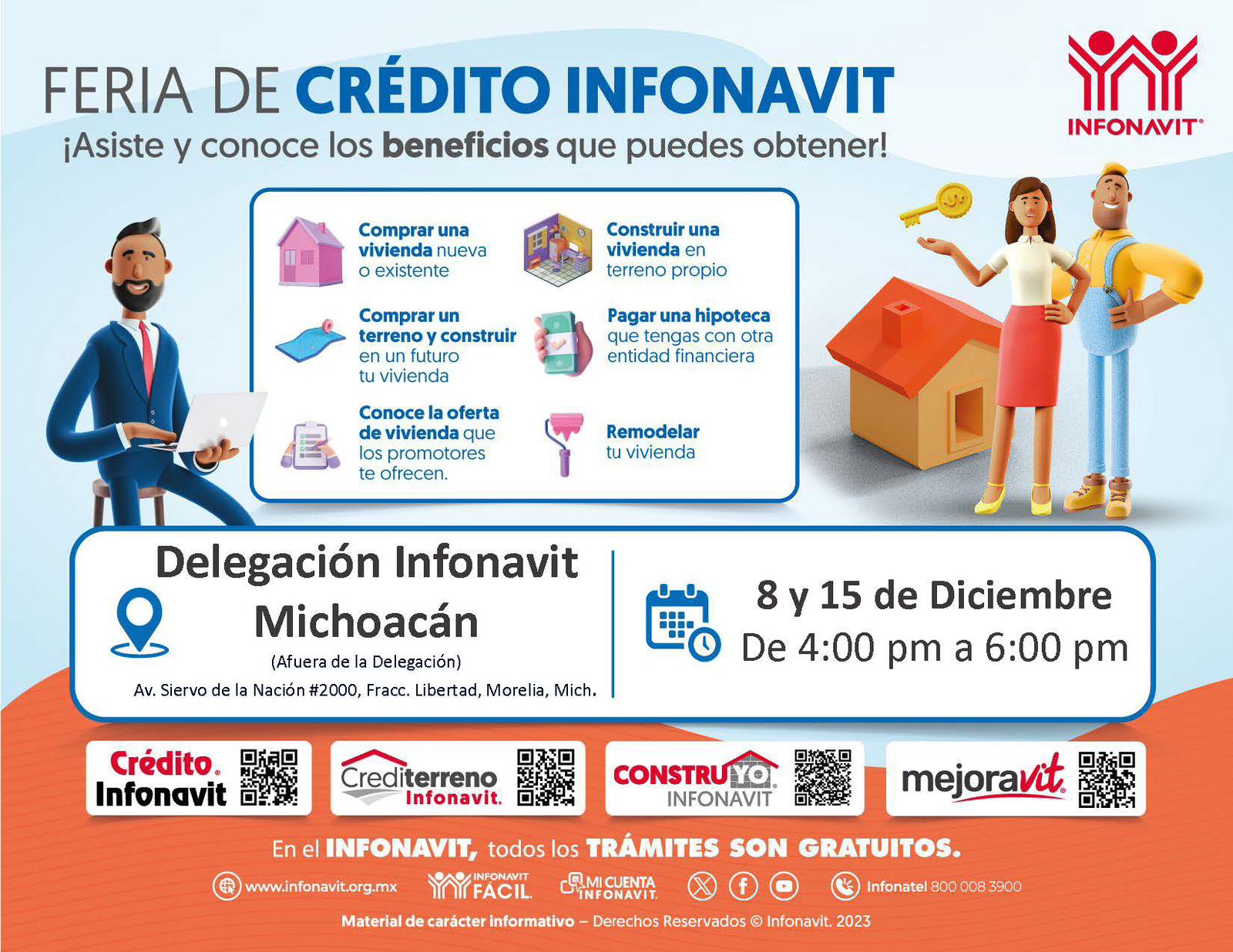 Morelia Michoacán a 08 de Diciembre de 2023. El Instituto del Fondo Nacional de la Vivienda para los Trabajadores (Infonavit) Realizará Ferias de Crédito en los municipios de Morelia y Lázaro Cárdenas, con el objetivo de acercar sus diferentes productos de crédito a las y los derechohabientes en el estado.