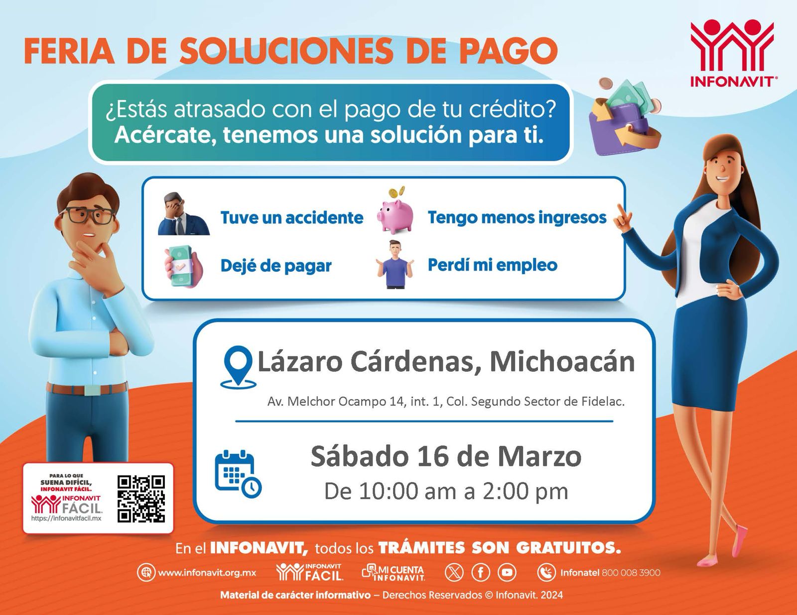Morelia, Michoacán, a 14 de marzo de 2024.-El Instituto del Fondo Nacional de la Vivienda para los Trabajadores (Infonavit) realizará una Feria de Soluciones de Pago en Lázaro Cárdenas, Michoacán, con el objetivo de brindar las alternativas de pago que tienen las y los acreditados que enfrentan dificultades para pagar la mensualidad de su crédito.