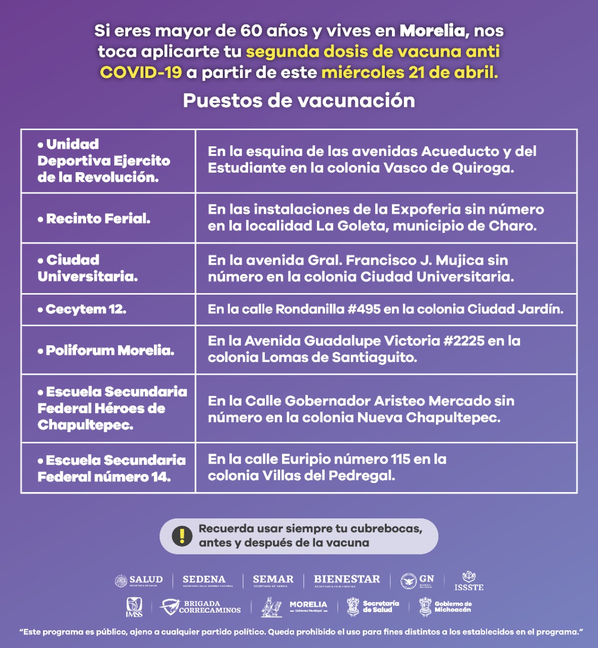 Morelia, Michoacán, a 19 de abril de 2021.- El Consejo Estatal de Vacunación (COEVA) informa que este miércoles 21 de abril comenzará la aplicación de las segundas dosis de vacuna anti COVID-19 en Morelia a 79 mil 76 adultos mayores de 60 años, a fin de completar su esquema de inmunización.