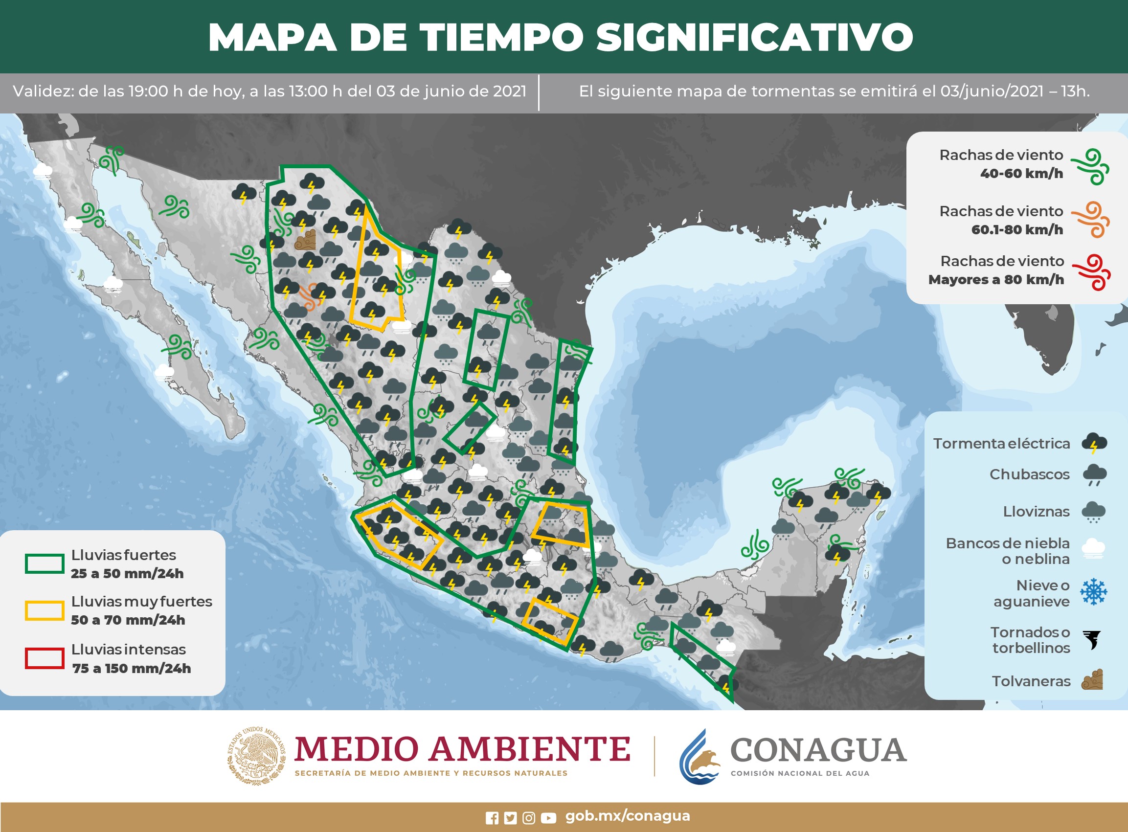 Una entrada de humedad por la corriente en chorro generará en la entidad, cielo medio nublado por la mañana y nublado por la tarde con lluvias puntuales fuertes y descargas eléctricas, además de posible granizo.
