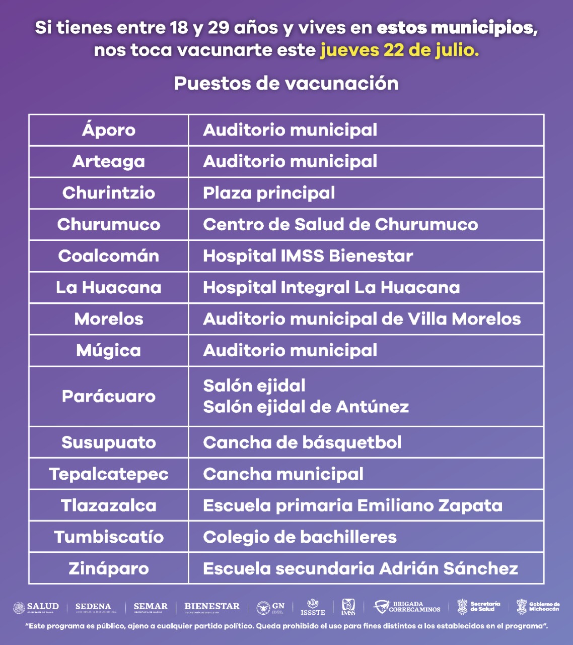 Morelia, Michoacán, a 21 de julio de 2021.- A partir del jueves 22 de julio, dará inicio la vacunación contra COVID-19 a población de entre 18 y 29 años de edad, en 14 municipios, informó la Secretaría de Salud de Michoacán (SSM).
