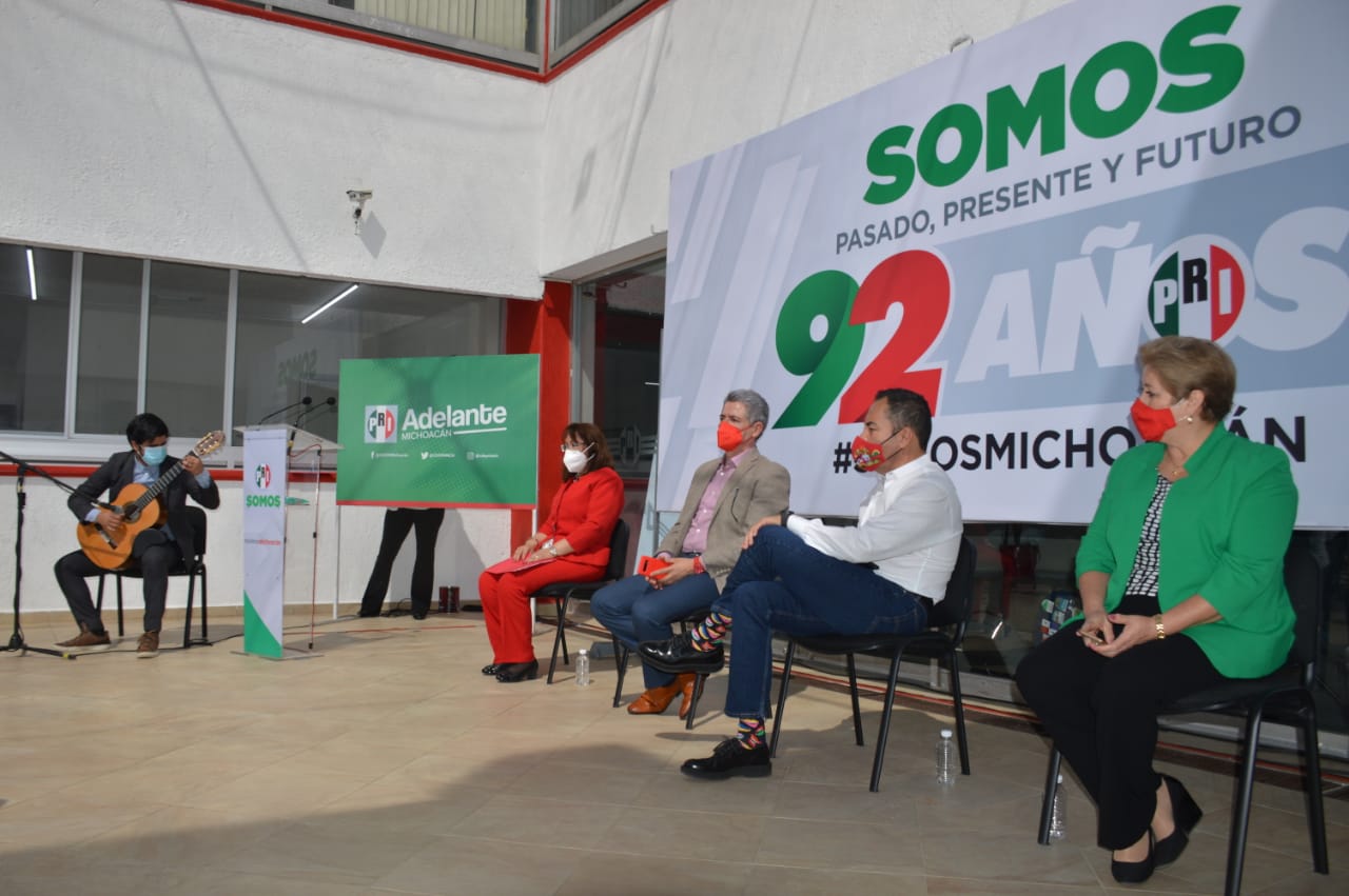 Morelia, Michoacán a 04 de marzo de 2021. En un evento dirigido a estructuras y militantes del tricolor, el presidente del Comité Directivo Estatal (CDE), Jesús Hernández Peña, acompañado de la Secretaria General, Rocío Luquín Valdés, encabezó la celebración del 92 Aniversario del Partido Revolucionario Institucional (PRI), en el que se reiteraron los principios del pensamiento democrático y la fuerza política del partido.