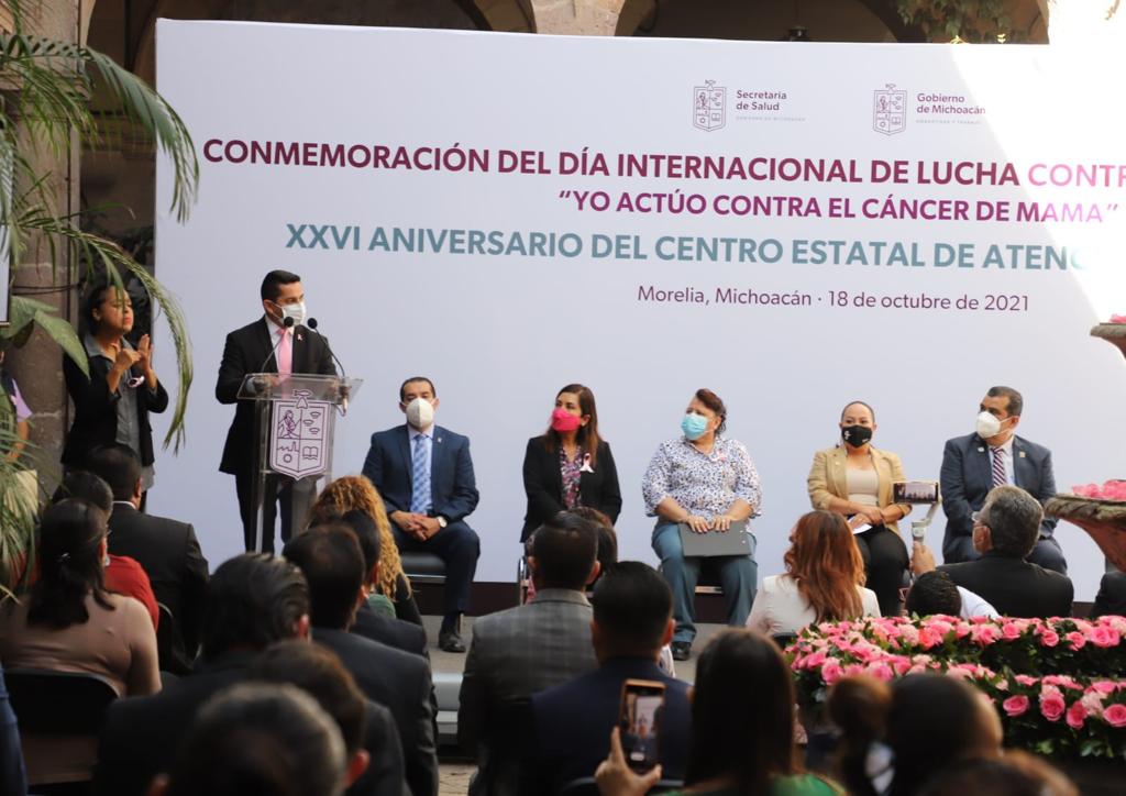 Morelia, Michoacán, 18 de octubre del 2021.- Prevenir, diagnosticar y tratar el cáncer de mama es un trabajo intersectorial y coordinado, por ello; la importancia de intensificar las campañas de concientización en las mujeres y acercarles servicios de salud gratuitos de calidad y con calidez, así lo puntualizó el secretario de Salud en Michoacán (SSM), Elías Ibarra Torres.