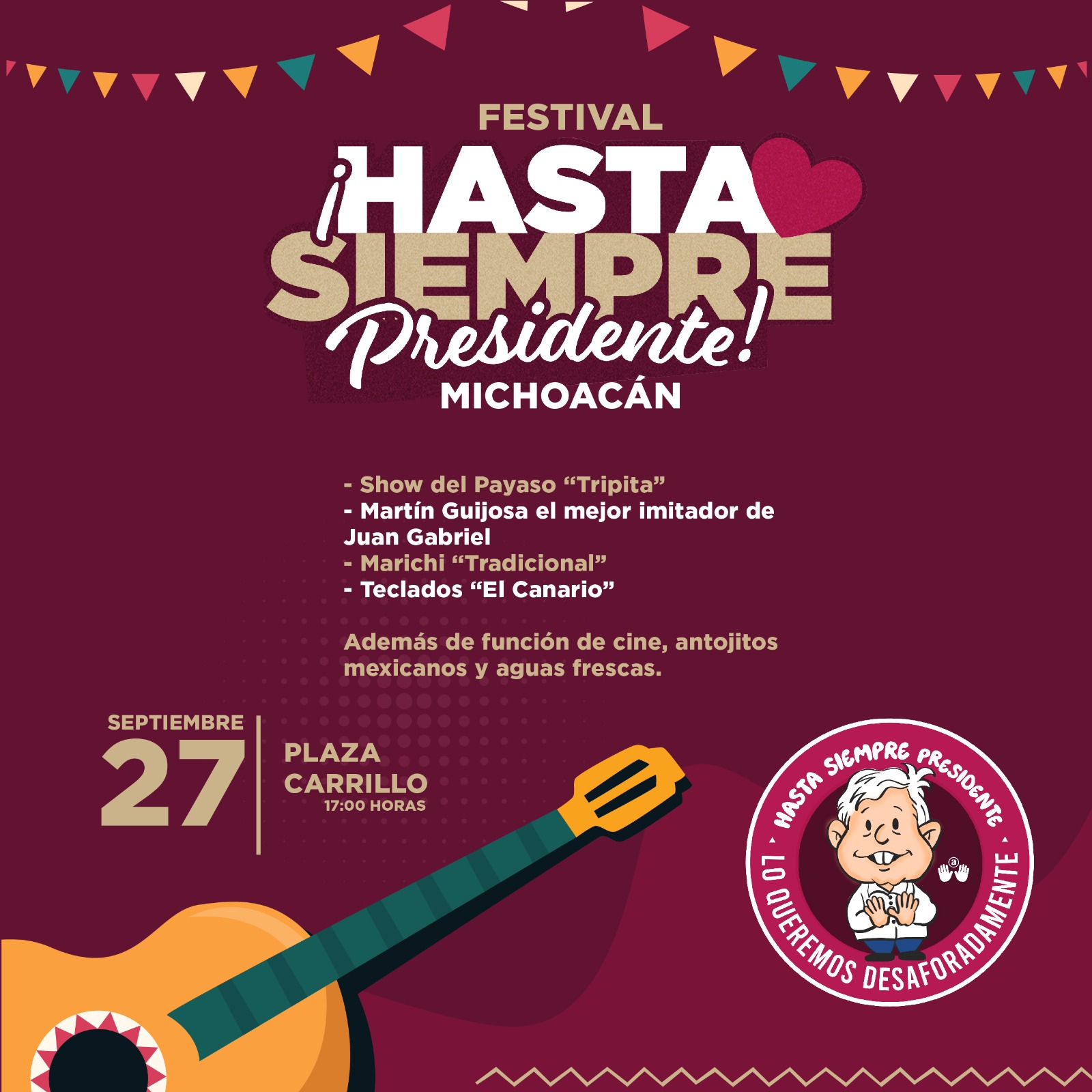 Morelia, Michoacán, a 25 de Septiembre de 2024.- A unos días de terminar el sexenio del presidente Andrés Manuel López Obrador, el vicepresidente del Congreso del Estado, Juan Carlos Barragán invita al festival “Hasta Siempre Presidente”, el próximo viernes 27 de septiembre en la plaza Carrillo a partir de las 17:00 horas.