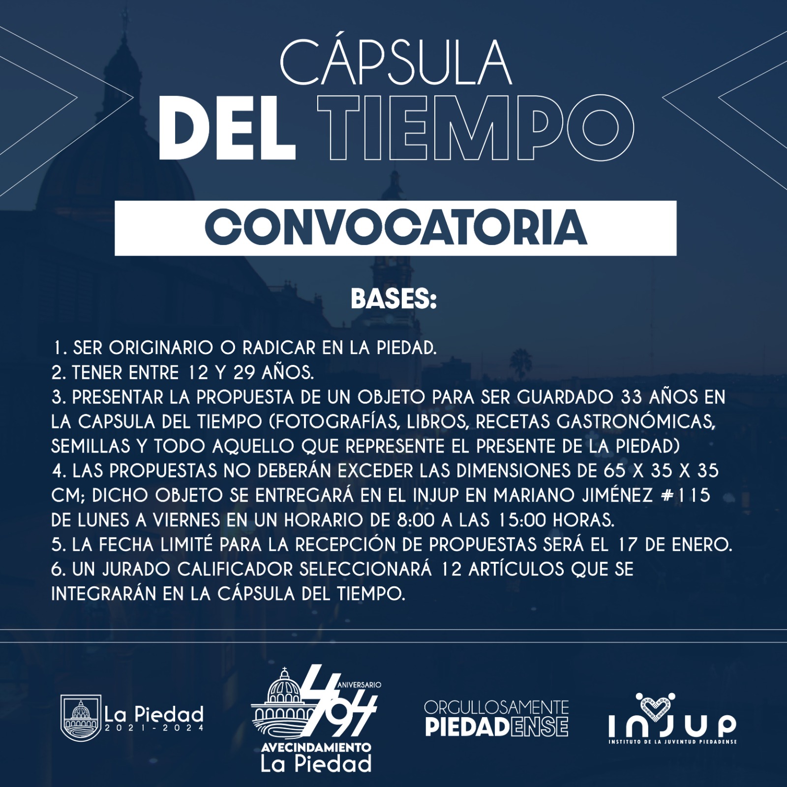 La Piedad Michoacàn a 03 de Enero de 2024.- En el marco del Avecindamiento de La Piedad, el Gobierno Municipal a través del Instituto de la Juventud Piedadense (INJUP) convoca a jóvenes de la ciudad a participar en la creación de la Cápsula del Tiempo.