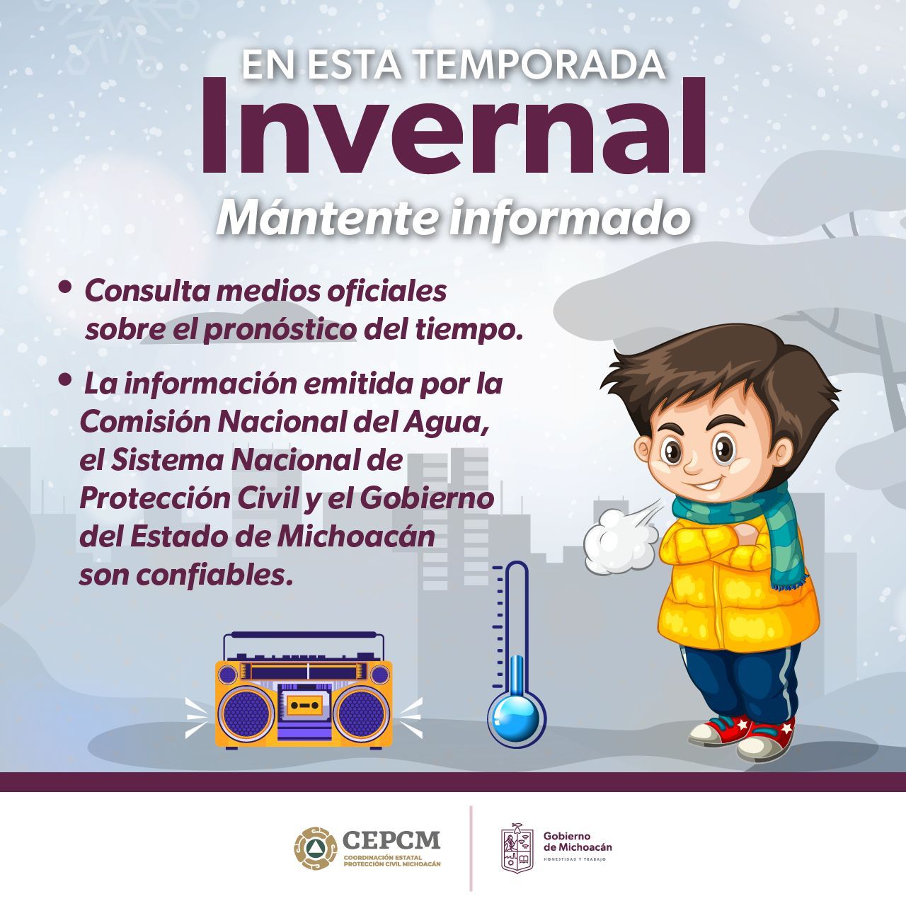 Morelia, Michoacán, 15 de diciembre del 2021.- La Secretaría de Gobierno a través de la Coordinación Estatal de Protección Civil exhorta a la población a mantenerse informada sobre las condiciones meteorológicas ante la temporada invernal.