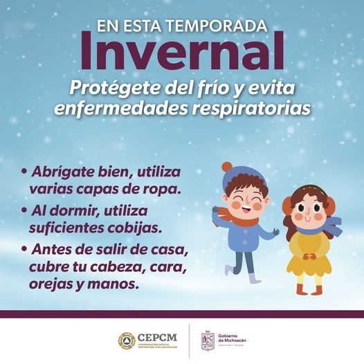 Morelia, Michoacán, 29 de noviembre de 2021.- La Secretaría de Gobierno a través de la Coordinación Estatal de Protección Civil invita a las y a los michoacanos a tomar medidas de prevención y de autocuidado por las temperaturas bajas que se esperan en las próximas horas. Lo anterior de acuerdo al pronóstico del Servicio Meteorológico Nacional, que indica la presencia en el país del frente frío número 11 y de una masa de aire frío que recorrerá gran parte del país, incluido Michoacán. Ante estas condiciones climáticas, se pide a la población estar atenta al desarrollo de las mismas, con la finalidad de evitar en la medida de lo posible, afectaciones a la salud y a la integridad física, es por ello que se recuerdan las recomendaciones que para estos casos, han dispuesto las autoridades en materia de protección civil: