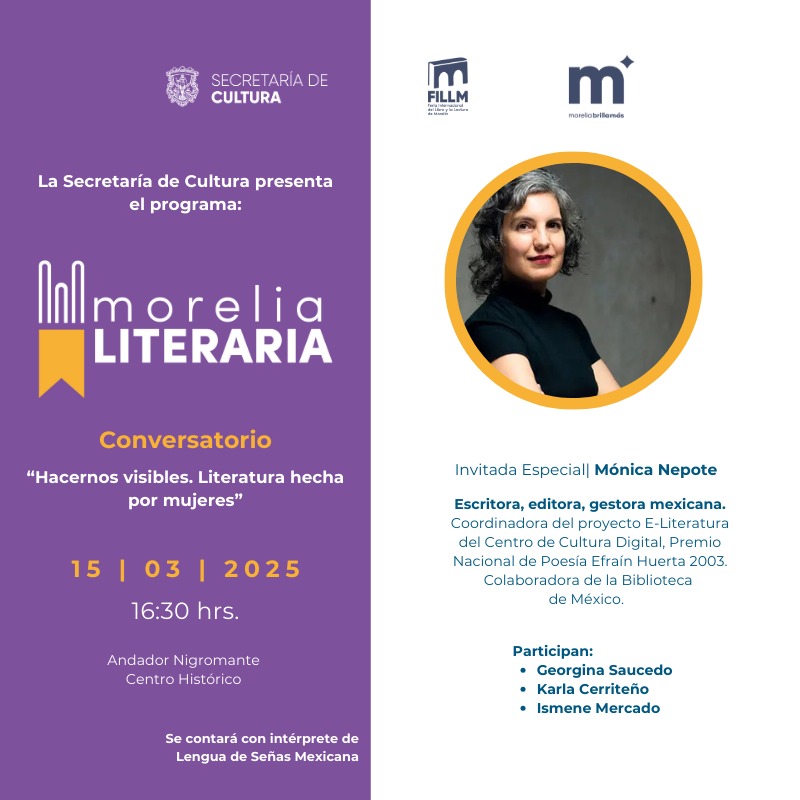 • Conversatorio “Hacernos visibles. Literatura hecha por mujeres”. 16:30 horas. Andador El Nigromante. Con Mónica Nepote. Participan: Karla Cerriteño, Georgina Saucedo e Ismene Mercado.