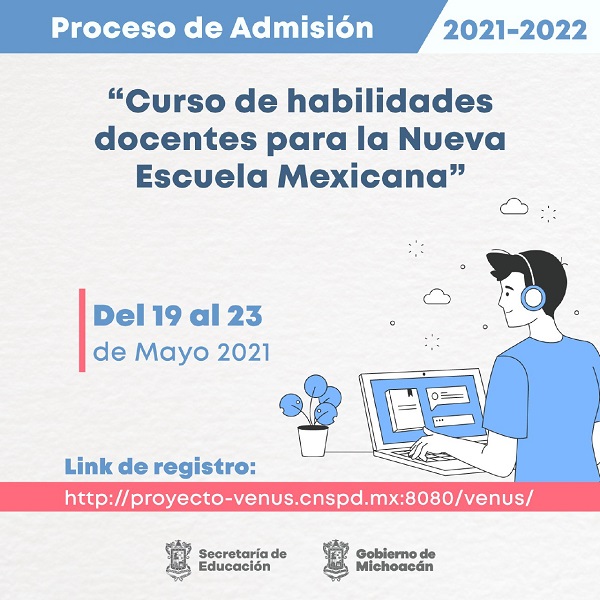Morelia, Michoacán; a 19 de Mayo de 2021.- La Secretaría de Educación en el Estado (SEE), a través de la Unidad Estatal del Sistema para la Carrera de las Maestras y Maestros (UESICAMM), invita a las y los egresados de escuelas normales públicas e instituciones de Educación Superior, tanto públicas como privadas, que participan en el Proceso de Admisión a Educación Básica Ciclo 2021-2022, a formar parte del “Curso de Habilidades Docentes para la Nueva Escuela Mexicana”.