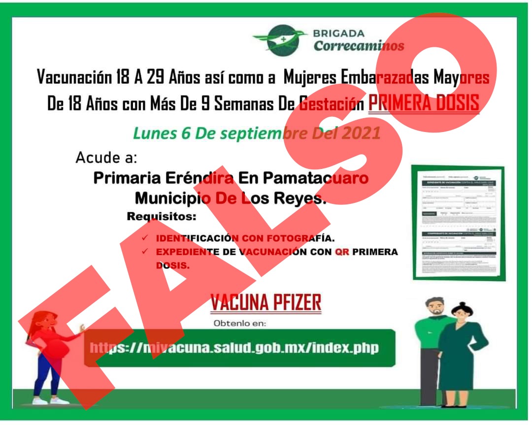 Morelia, Michoacán, a 7 de septiembre de 2021.- La Secretaría de Salud de Michoacán (SSM), informa que la información que circula sobre una supuesta jornada de vacunación anti COVID-19 en Los Reyes a la población de 18 a 29 años y embarazadas, es falsa.
