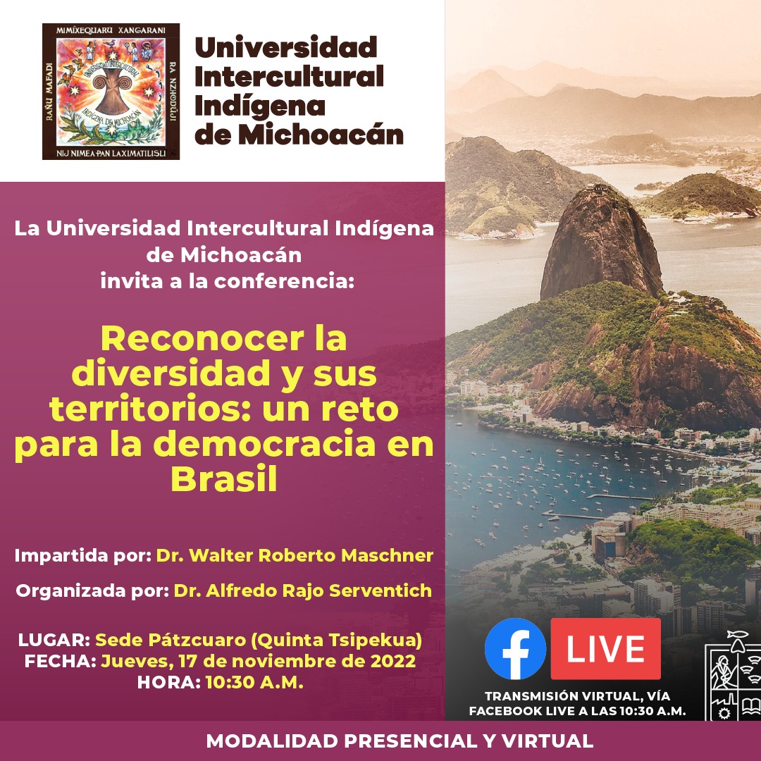 El primer evento será la conferencia denominada “Reconocer la diversidad y sus territorios: un reto para la democracia en Brasil” , que se realizará el próximo jueves 17 de noviembre a las 10:30 horas, en la Quinta La Tzipekua, del municipio de Pátzcuaro.