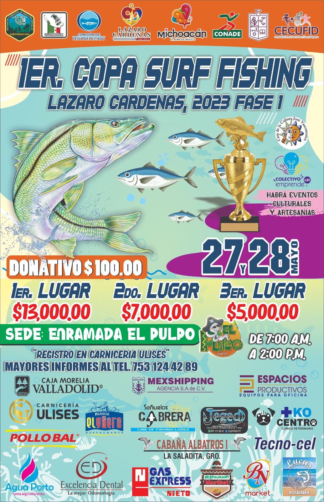 Cd. Lázaro Cárdenas, Michoacàn a 15 de Mayo del 2023.- El Gobierno Municipal hace la invitación a todos los aficionados a la pesca a participar al 1er. Copa Surf Fishing 2023 en su Fase 1; el cual se realizará los días 27 y 28 de mayo en playa Jardín en la Enramada el Pulpo.