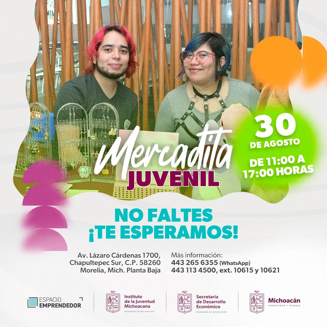 Morelia, Michoacán, 29 de Agosto de 2024.- La Secretaría de Desarrollo Económico (Sedeco) informó que mañana viernes 30 de agosto se realizará una mercadita en la que participarán cerca de 15 jóvenes emprendedores con exhibición y venta de productos de beneficiarios de Espacio Emprendedor.