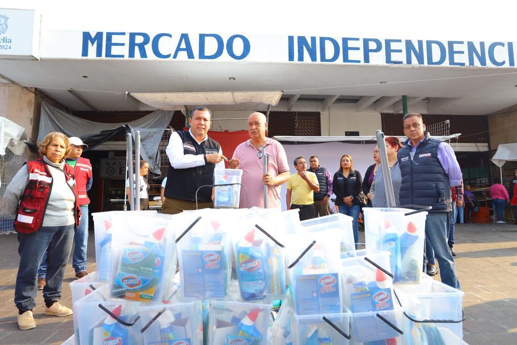 Morelia, Michoacán, a 23 de Mayo de 2023.- Con el objetivo de seguir apoyando a las y los comerciantes del mercado Independencia, el diputado Juan Carlos Barragán Vélez, entregó material de limpieza para la reactivación de los negocios de manera segura.