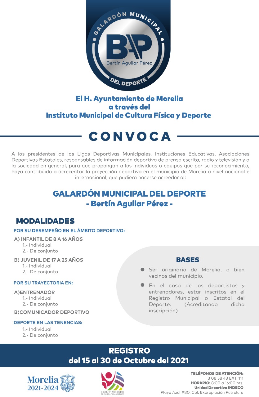 Morelia, Mich., a 18 de octubre del 2021. – Con el objetivo de reconocer a las figuras más representativas del deporte moreliano, el Gobierno Municipal, encabezado por Alfonso Martínez Alcázar, lanzó la convocatoria para la sexta edición de la entrega del Galardón Municipal del Deporte “Bertín Aguilar Pérez”, que permanecerá abierta hasta el 30 de octubre de 2021.