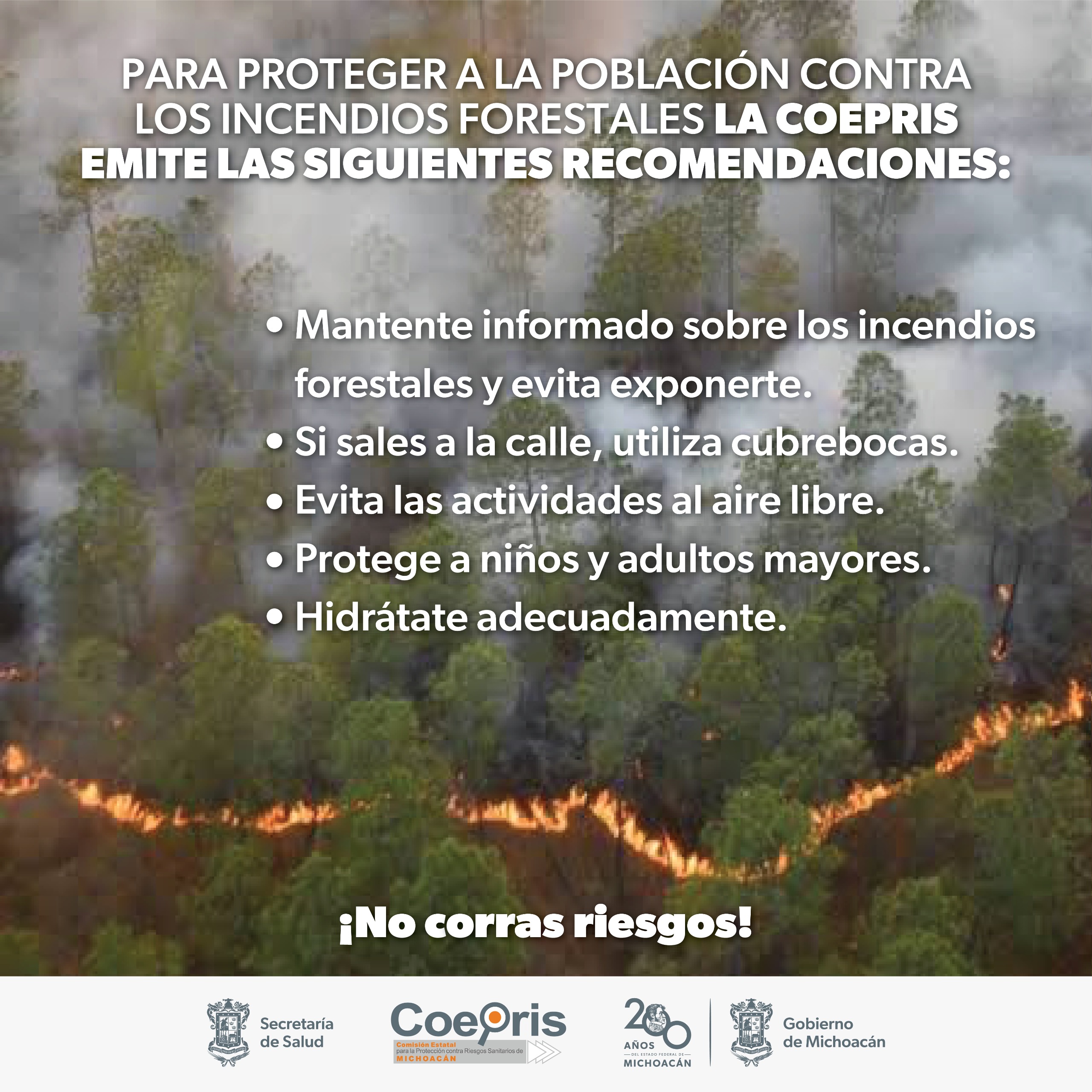 Para ello la Comisión Estatal para la Protección contra Riesgos Sanitarios (Coepris) cuenta con 54 brigadistas distribuidos en ocho municipios, quienes tienen a su cargo la encomienda de proteger la salud de la población que pudiera estar vulnerable, así como prevenir riesgos sanitarios y enfermedades respiratorias por la inhalación del humo.