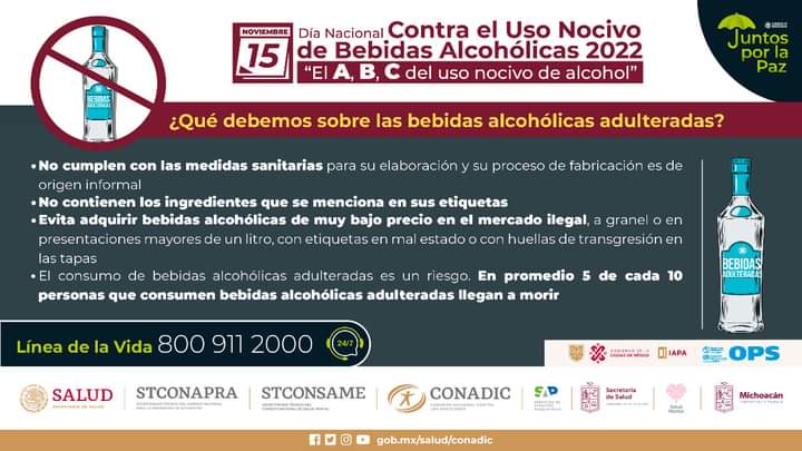 Morelia, Michoacán, 15 de noviembre del 2022.- En el Día Nacional contra el Uso Nocivo de Bebidas Alcohólicas, la Secretaría de Salud de Michoacán (SSM) exhorta a la población a evitar el consumo y compra de bebidas alcohólicas adulteradas.