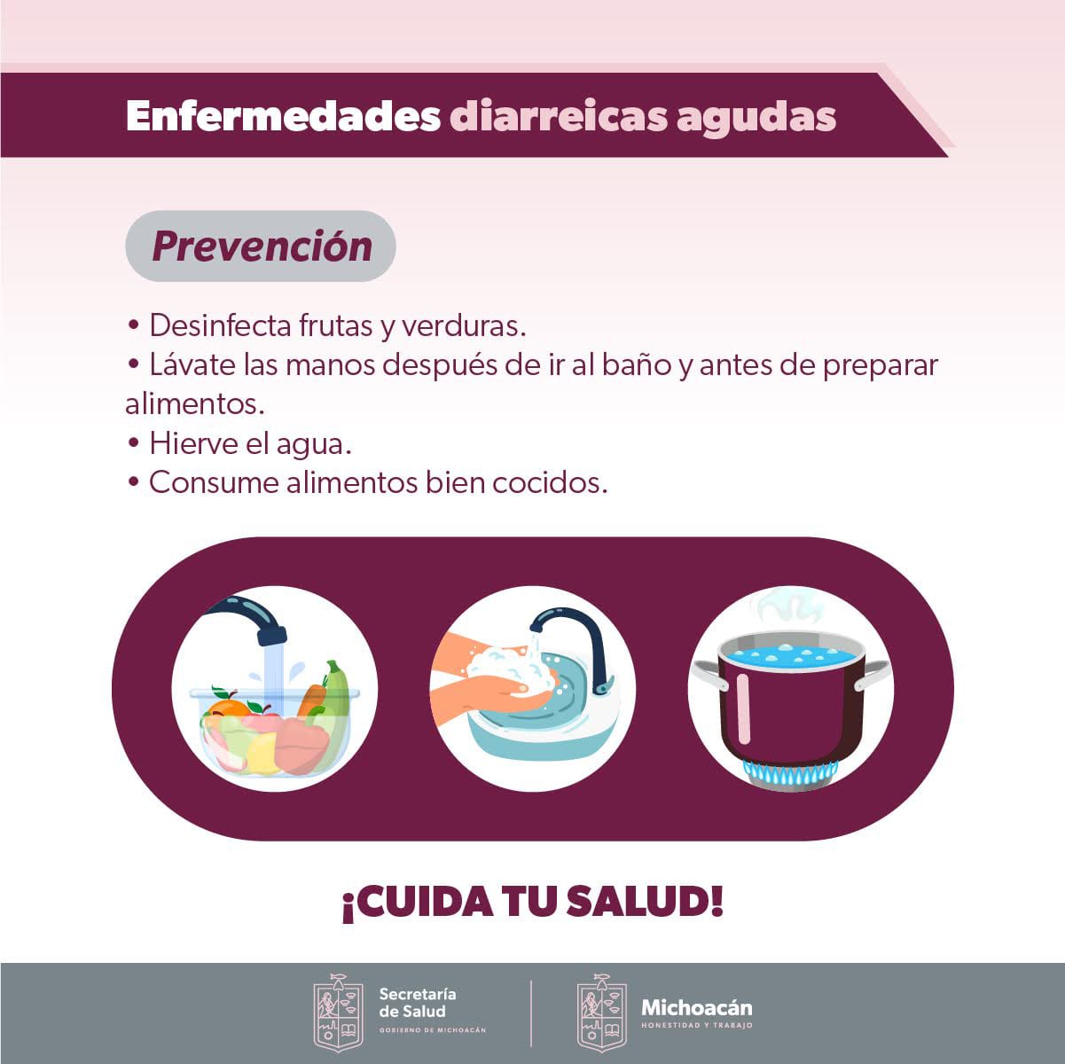 Morelia, Michoacán, 18 de abril de 2023.- Las enfermedades gastrointestinales generalmente son ocasionadas por bacterias, parásitos, virus y alimentos con grasas; así como por la falta de higiene, lo que provoca diarrea y por consiguiente deshidratación, informó la Secretaría de Salud de Michoacán (SSM).
