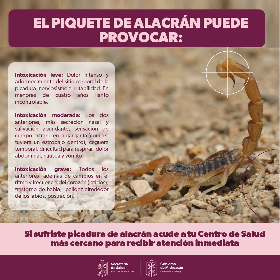 La gravedad de la intoxicación dependerá de las características de cada persona y el tipo de alacrán; en caso de picadura, se debe guardar calma, no untar ni utilizar remedios caseros y acudir al centro de salud u hospital más cercano, para que un profesional evalúe la gravedad y aplique suero anti-alacrán.