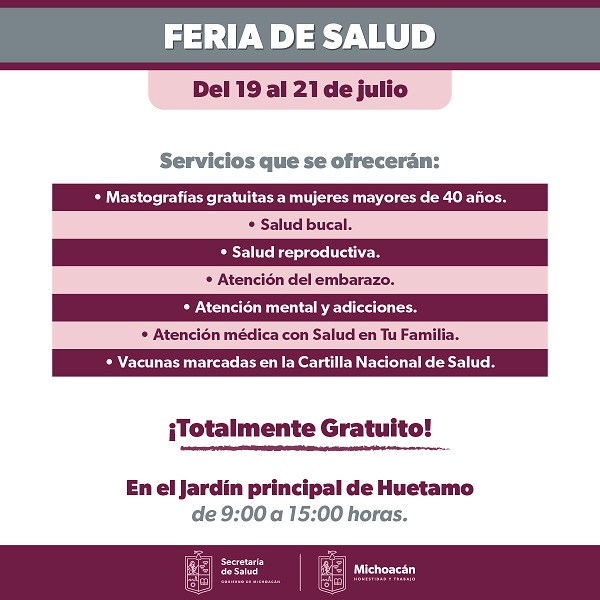 Morelia, Michoacán a 19 de Julio de 2023.- La Secretaría de Salud de Michoacán (SSM) llevará los servicios médicos integrales del programa Salud en tu Familia al jardín principal de Huetamo, para brindar consultas, estudios de laboratorio y medicinas gratuitas a la población, del 19 al 21 de julio.