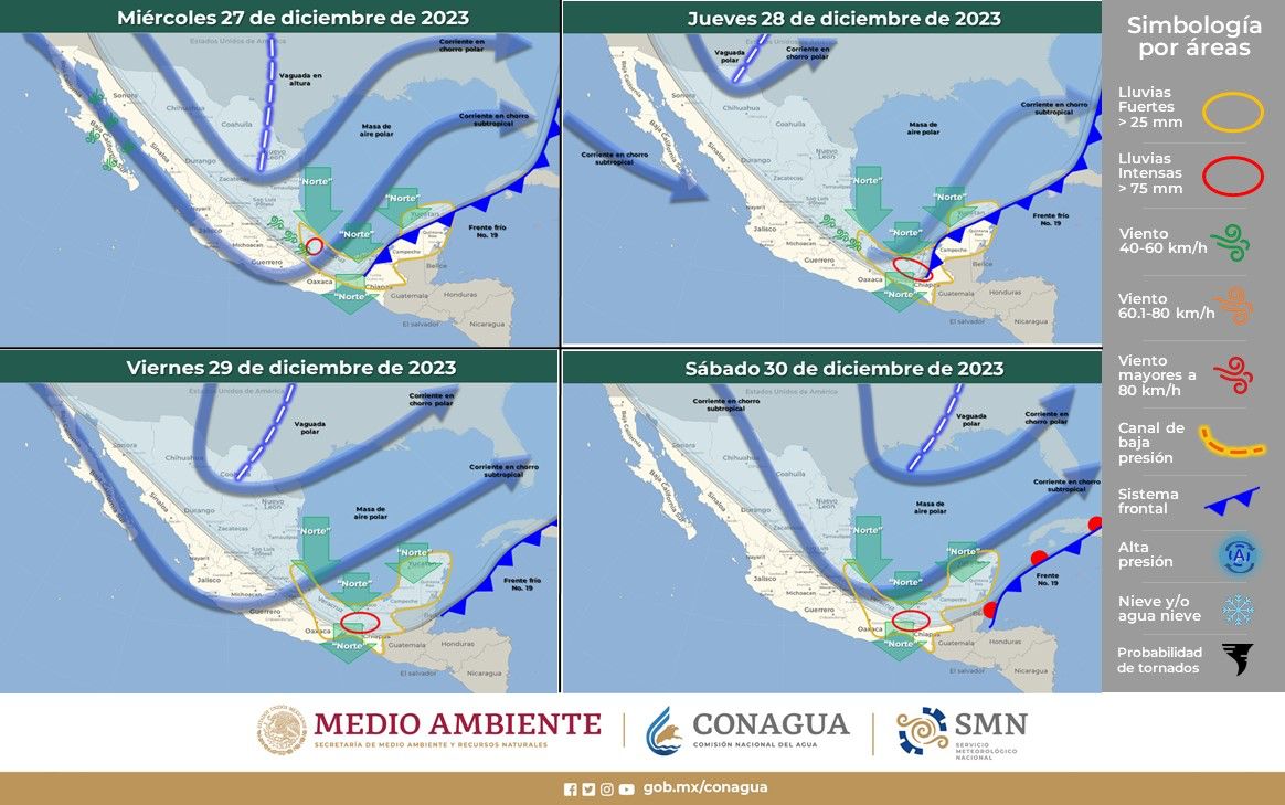 De acuerdo a la información del Servicio Meteorológico Nacional (SMN), una masa de aire frío asociada al frente frío número 19, ocasionará precipitaciones fuertes en el estado que podrían estar acompañadas de descargas eléctricas, posible caída de granizo y fuertes rachas de viento.