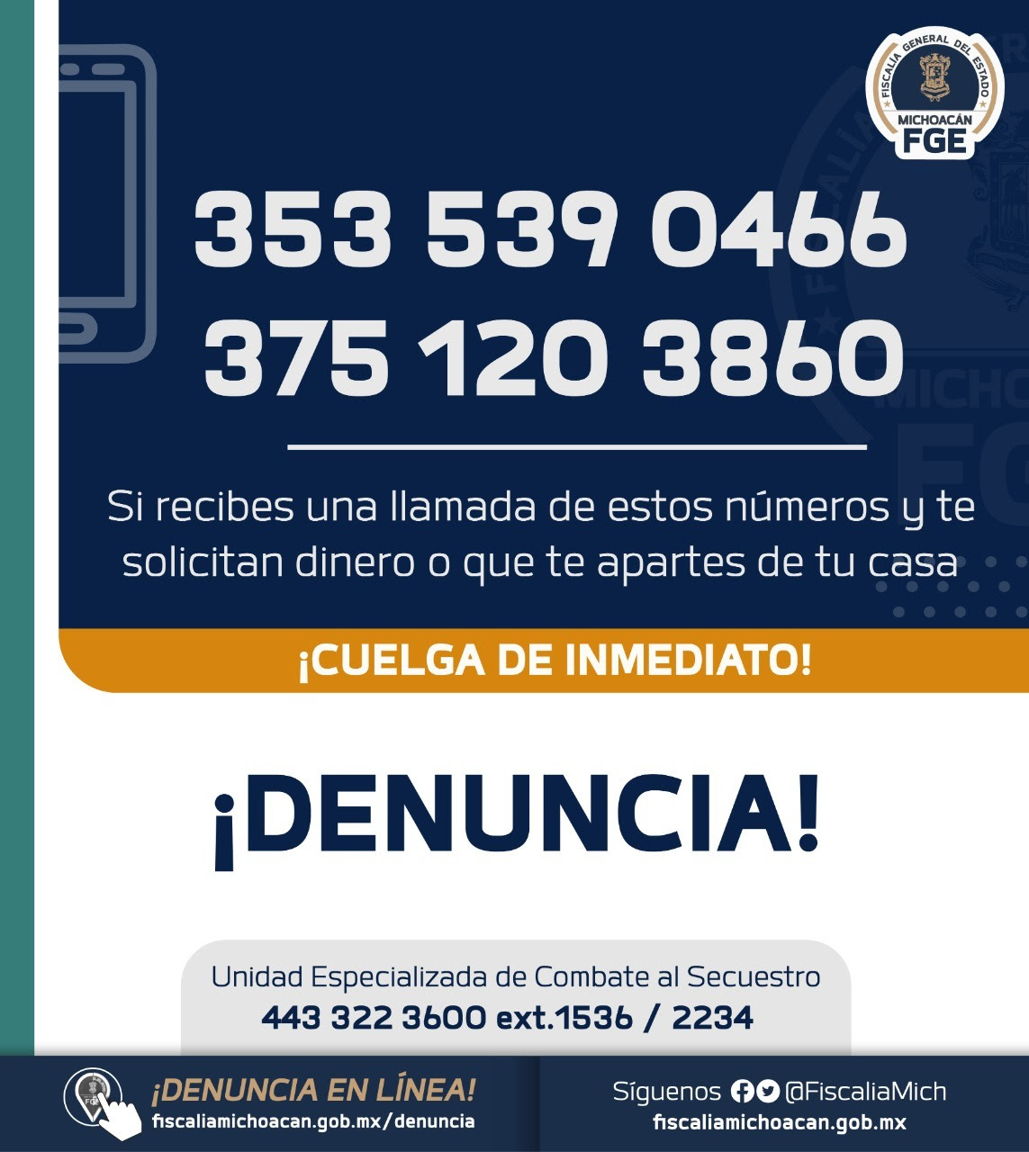 La FGE solicita a la población a no atender este tipo de llamadas, y denunciarlas de forma inmediata ante la Fiscalía Regional más cercana, o bien a la Unidad Especializada de Combate al Secuestro, ubicada en Periférico Independencia #5000, colonia Sentimientos de la Nación en Morelia, o comunicarse al teléfono 443 322 36 00 extensión 2234.