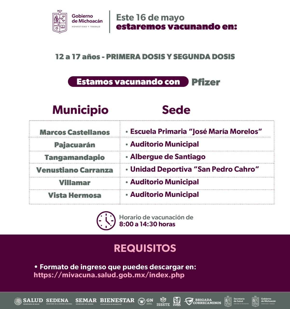 En Pajacuarán, Villamar, Vista Hermosa, Ixtlán y Briseñas, la sede de vacunación será su respectivo auditorio municipal, donde personal aplicará la vacuna desde las 8:30 hasta las 14:30 horas; mientras que en Chavinda será en el Salón Nacional, en Ecuandureo será en su centro de salud, Tangamandapio contará con el Albergue de Santiago.