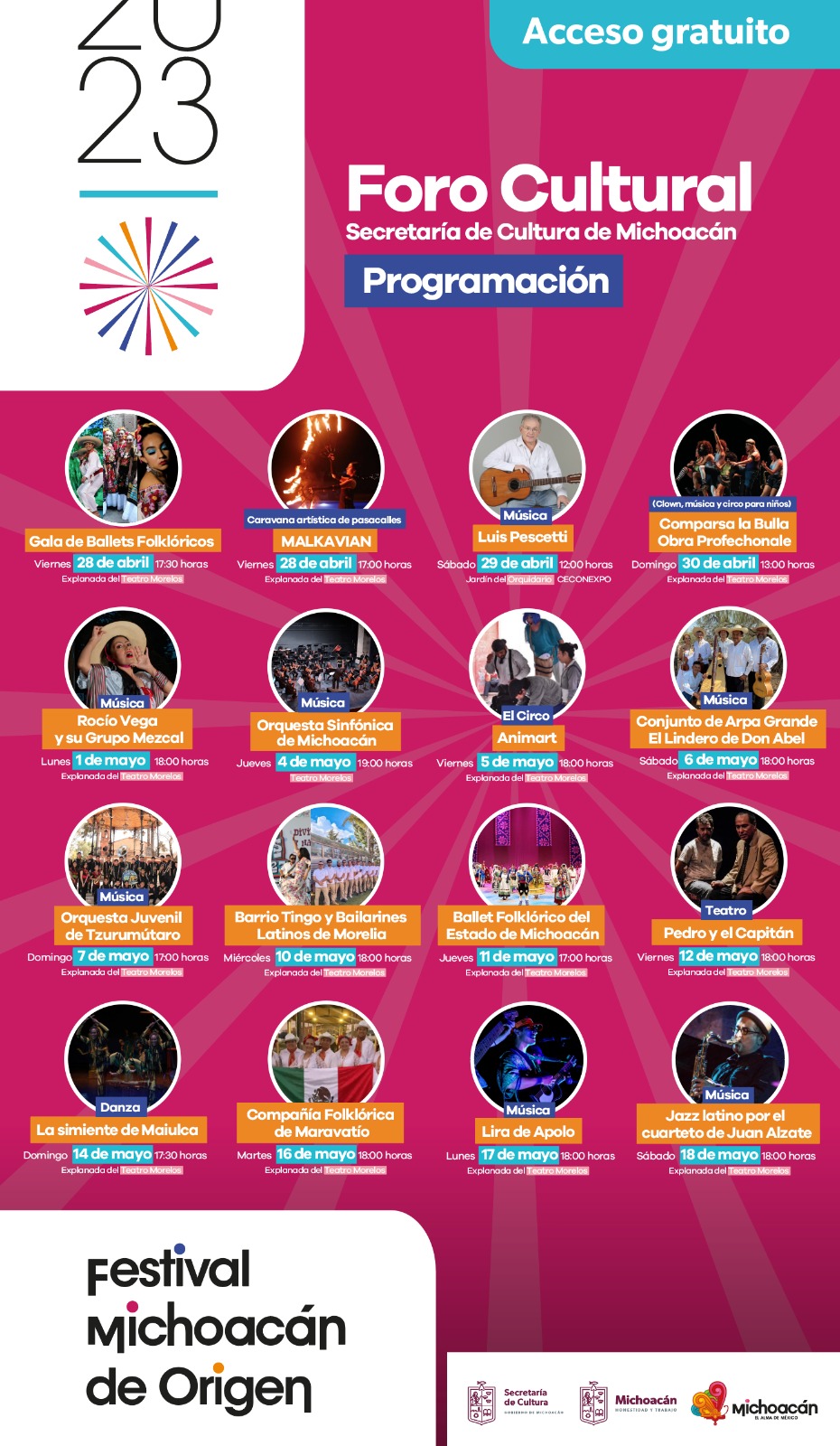Morelia, Michoacán, 26 de abril de 2023.- Más de 16 funciones ofrecerá el foro cultural del Festival Michoacán de Origen, a través de la Secretaría de Cultura de Michoacán (Secum), del 28 de abril al 18 de mayo del año en el Centro de Convenciones y Exposiciones de Morelia (Ceconexpo).
