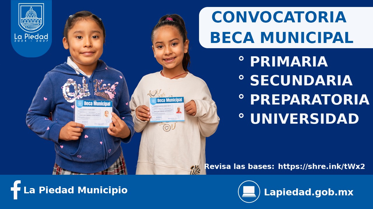 La Piedad, Michoacàn a 27 de Agosto del 2025.- Con el objetivo de contribuir e impulsar la educación de niños, adolescentes y jóvenes, el Gobierno Municipal de La Piedad, a través de la Dirección de Educación, emite la convocatoria para ser beneficiario de la Beca Municipal para el ciclo escolar 2025 – 2026.