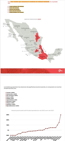 El estudio refiere que las entidades con mayor número de feminicidios, entre enero y marzo del 2023, fueron el Estado de México, con 25 víctimas; Oaxaca con 23; Veracruz con 19; Nuevo León con 15 y Ciudad de México con 14 casos.