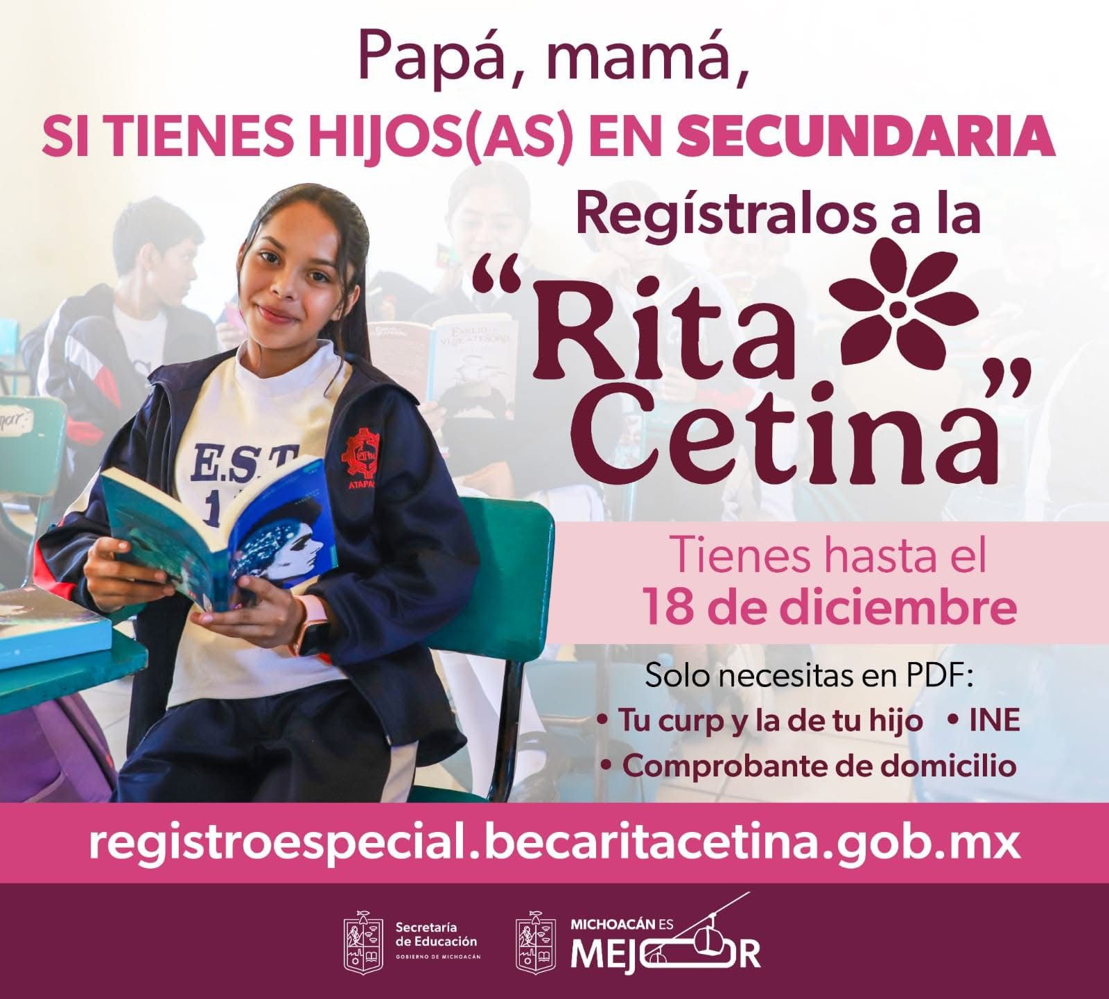 Morelia, Michoacán, 16 de Diciembre de 2024.- El periodo para el registro de la beca Rita Cetina finaliza el miércoles 18 de diciembre, por lo que la Secretaría de Educación del Estado (SEE) hace un llamado a las y los padres de familia para que inscriban a sus hijas e hijos.