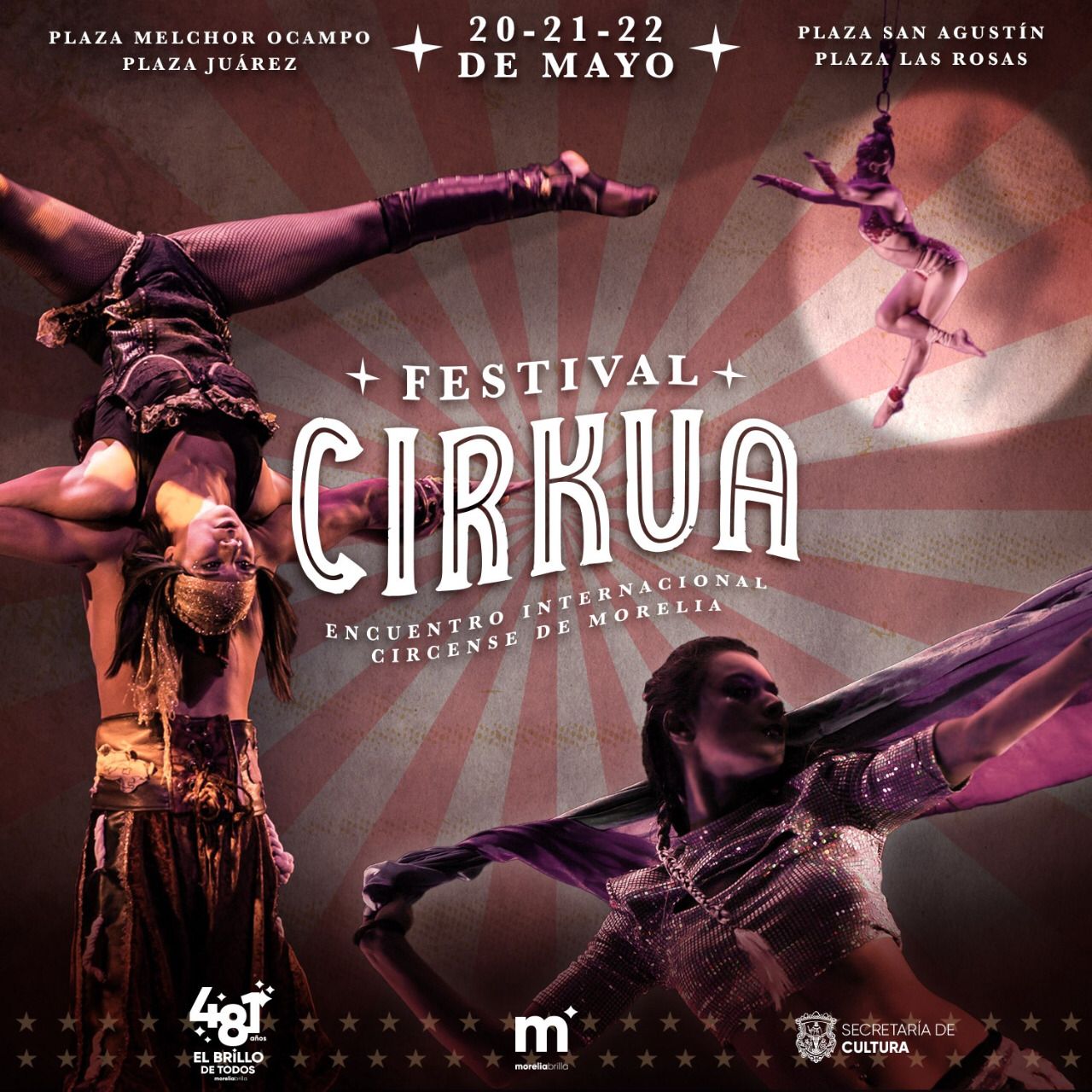 Morelia, Michoacán; a 16 de mayo de 2022.- En el 481 aniversario de su fundación, Morelia será el epicentro del arte circense a través del “Festival Cirkua”, evento que reúne a lo mejor del talento local para la celebración de diferentes espectáculos en plazas del centro de la ciudad, que serán del agrado de toda la familia.