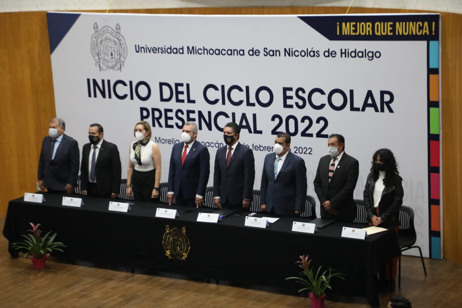 Al participar en el arranque formal del ciclo escolar presencial 2022 de la UMSNH, junto a la secretaria de Educación, Yarabí Ávila González y el rector Raúl Cárdenas Navarro, el gobernador del estado invitó a los jóvenes a mantenerse atentos a la publicación de la convocatoria.