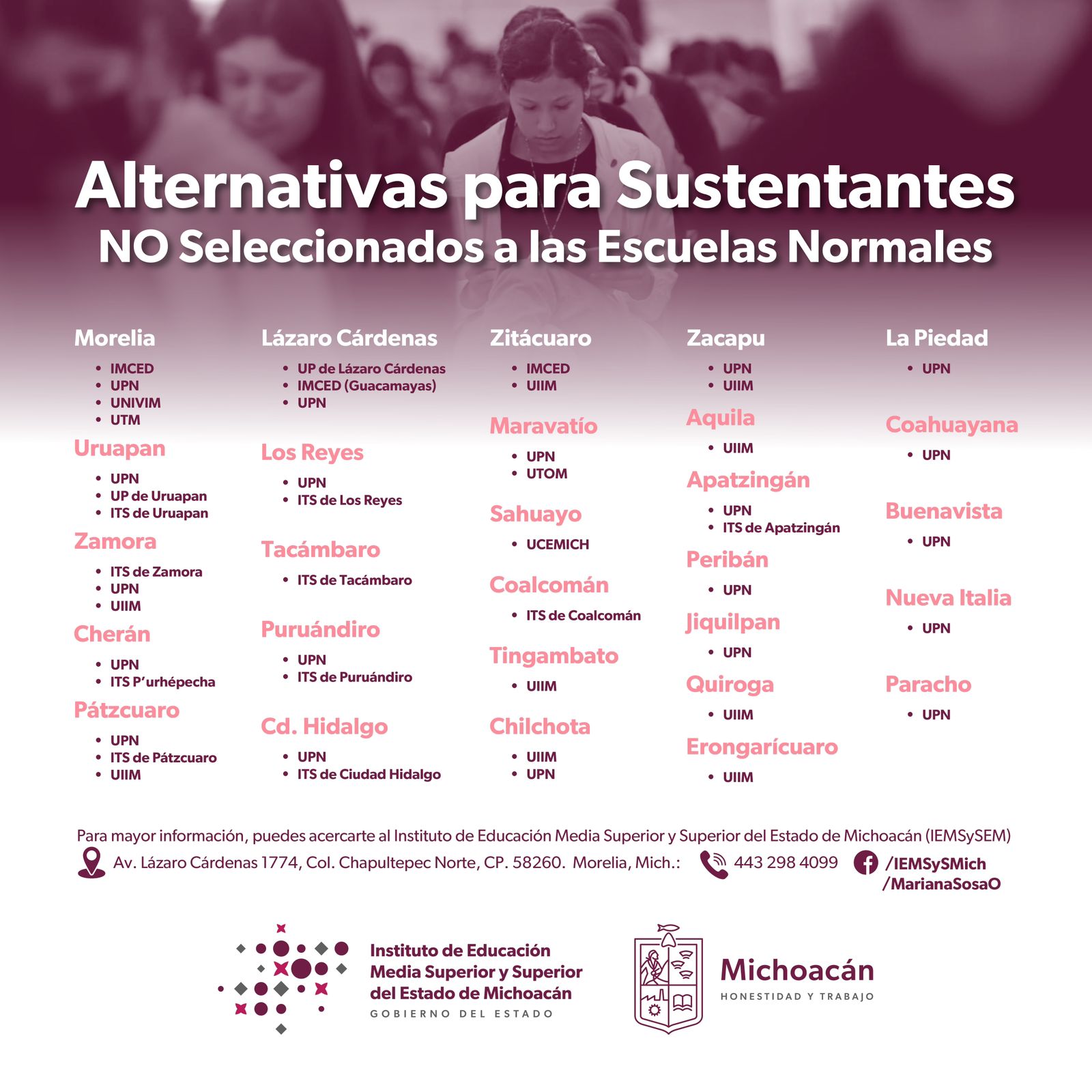 Tanto la Universidad Pedagógica Nacional (UPN) como el IMCED ofrecen los programas de licenciatura enfocados a la pedagogía y la formación docente. Cualquier duda o información las y los interesados pueden recurrir a la página en Facebook del IEMSySEM: https://www.facebook.com/IEMSySMich/