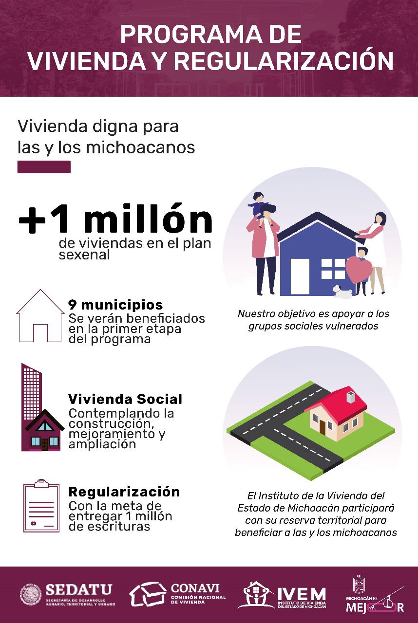 Las viviendas se edificarán en Nocupétaro, Sahuayo, Pátzcuaro, Vista Hermosa, Yurécuaro, Coeneo, Maravatío, Jiquilpan y Tarímbaro, para ello, el IVEM participará con la aportación de su reserva territorial para arrancar con la primera etapa del programa.