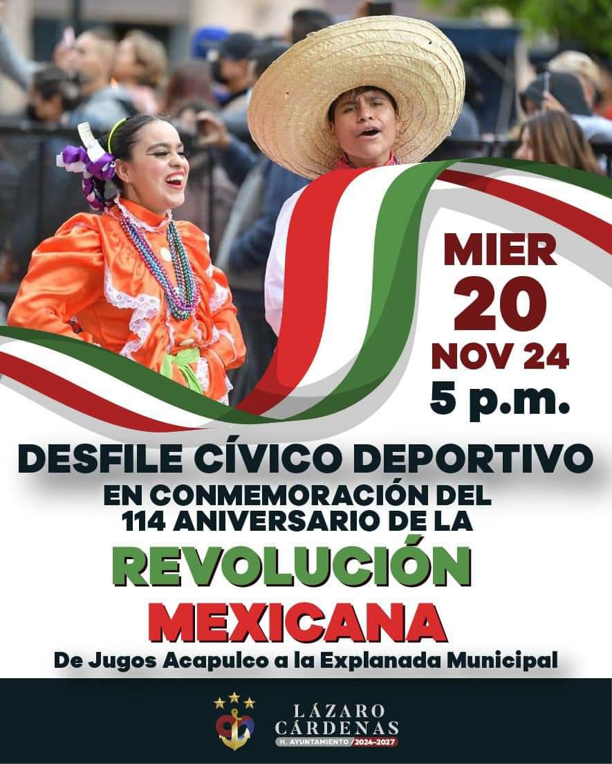Cd. Lázaro Cárdenas, Michacàn a 19 de Noviembre de 2024.- El Gobierno Municipal recuerda a la población en general que este año el Desfile Deportivo-Militar- conmemorativo al CXIV Aniversario de la Revolución Mexicana, se llevará a cabo este miércoles a las 17:00 horas partiendo en su ruta tradicional, iniciando de Jugos Acapulco sobre la avenida Lázaro Cárdenas hasta llegar al Palacio Municipal.