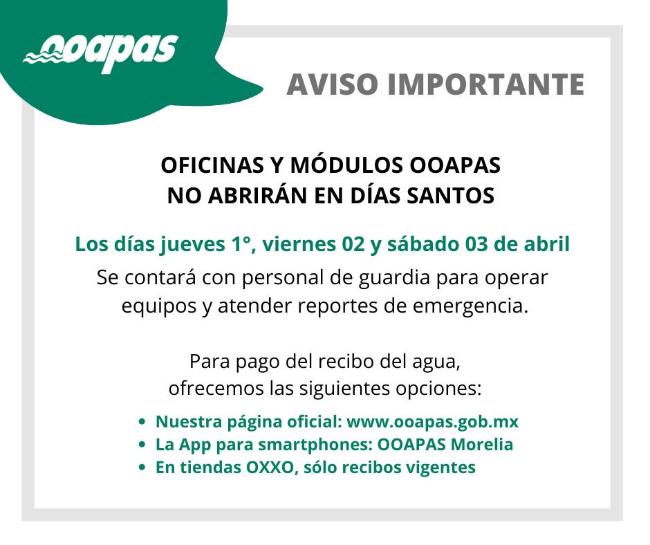 Morelia, Michoacán a 31 de marzo de 2021.- El Organismo Operador de Agua Potable, Alcantarillado y Saneamiento de Morelia (OOAPAS) informa que debido al asueto oficial por las celebraciones de Semana Santa no funcionarán oficinas ni módulos de pago los días jueves 01, viernes 02 y sábado 03 de abril.