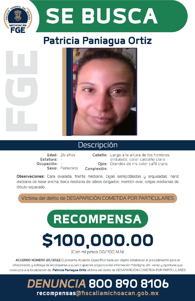 Por lo anterior y de conformidad con las atribuciones que le confiere la Ley Orgánica de la Fiscalía General del Estado de Michoacán para el Ofrecimiento y Entrega de Recompensas, el maestro Adrián López Solís, Fiscal General, firmó el acuerdo 25/ 2022 de ofrecimiento y entrega de 100 mil pesos de recompensa por la información que conduzca a la localización de Patricia Paniagua Ortiz.