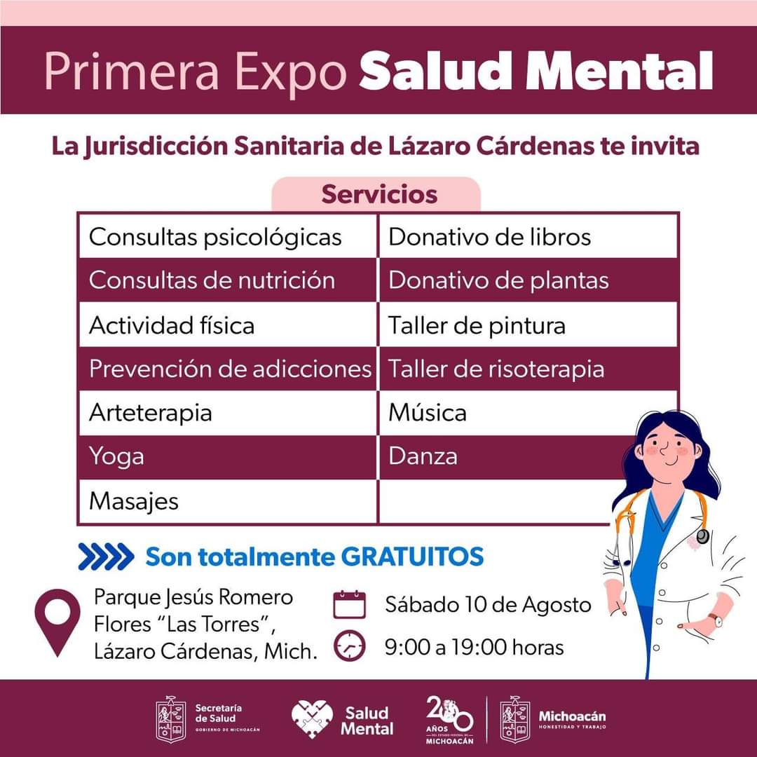 Lázaro Cárdenas, Michoacán, 9 de Agosto de 2024.- La Secretaría de Salud de Michoacán (SSM) ofrecerá consultas psicológicas gratuitas, talleres de prevención del suicidio, arteterapia y yoga, en la primera Expo Salud Mental en Lázaro Cárdenas, mañana sábado 10 de agosto, en el parque Jesús Romero Flores.