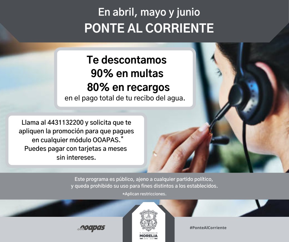 Morelia, Michoacán; a 14 de abril de 2021.- A partir de este miércoles, el Organismo Operador de Agua Potable Alcantarillado y Saneamiento de Morelia (OOAPAS) arrancará un programa de descuentos llamado “Ponte al corriente”, dirigido a los usuarios que presentan rezago en su recibo del agua, para que puedan ponerse al corriente.