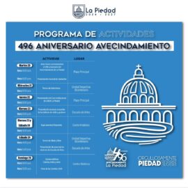 La Piedad, Michoacàna a 19 de Enero del 2026.- Con motivo del 496 aniversario del avecindamiento de La Piedad, el Gobierno Municipal, encabezado por el presidente Samuel Hidalgo, invita a las familias piedadenses y a la ciudadanía en general a participar en las actividades conmemorativas que se han...